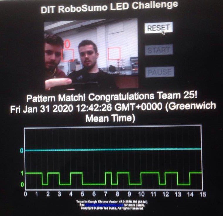 Once we had completed the previous challenge we then had to make the circuit produce two binary numbers using two LED’s, one representing 0 and the other 1. We completed this with the program inteed detecting the pattern.
