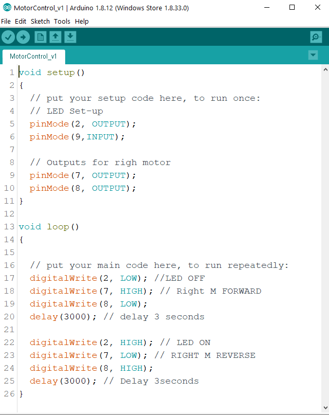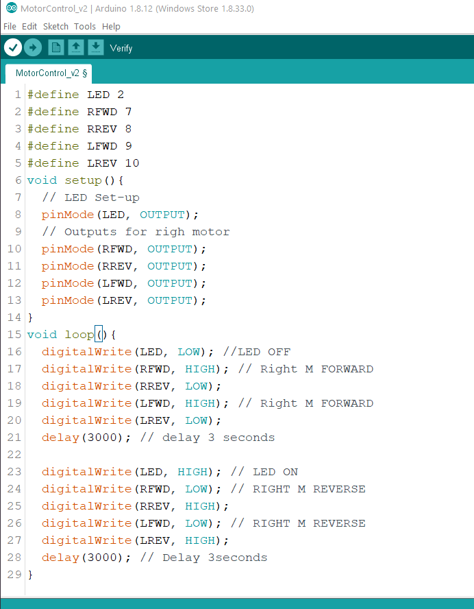 For this we haven’t included any sensors to the system yet, we added the second motor and added it to the same functions as in MotorControl_v1 but now with two motors and we redeclared the outputs as #define. This program gave use the desired functionality of both motors forward for three seconds with LED Off and reverse for three seconds with the LED on.