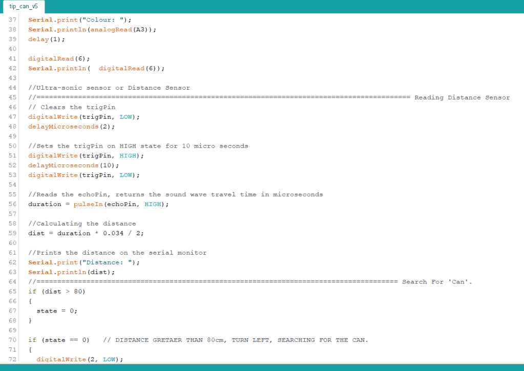 The program worked well, it accuratly calculated distances, we checked using a ruler. Unfortunatly within approximatly 2cm the sensor becomes inaccurate it can read anything from 3cm up to 1023 cm. I believe this is due to the gap between the trigger and the echo. This shouldn’t be too much of an issue, for tip the can it would have been nice if the sensor was accurate all the way to 0cmor 0.1cm as we could avoid using a switch to tell when the robot has made contact with the can and instead use the sensor. This could be done by mounting the sensor more than 2 cm from the front but I don’t believe this is a reliable way of determining if the can has been tipped. .
