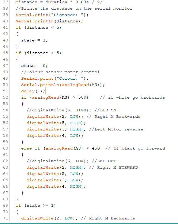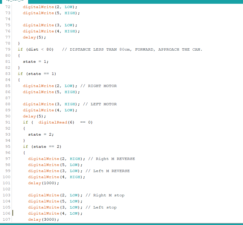 The first step was to integrate the Ultra-Sonic Sensor and IR Sensor into the motor control program. This allows us to implemet real control as the robot is able to “see” what is infront of it. Meaning we can implement functions instructing it what to do if it detects an object infront of it, i.e. the can.