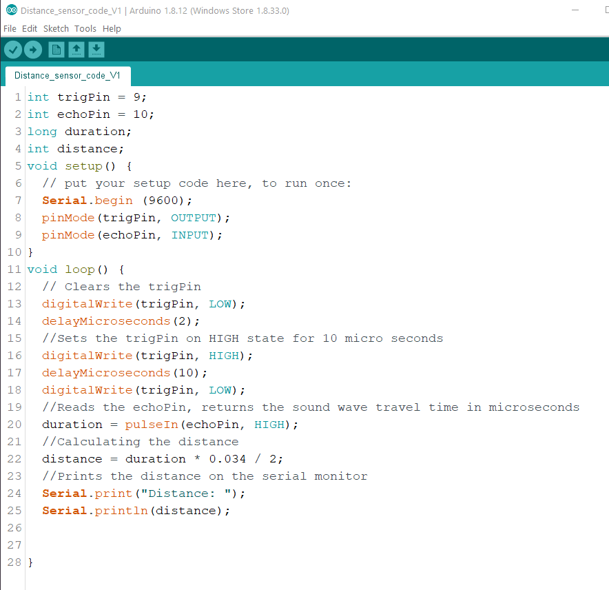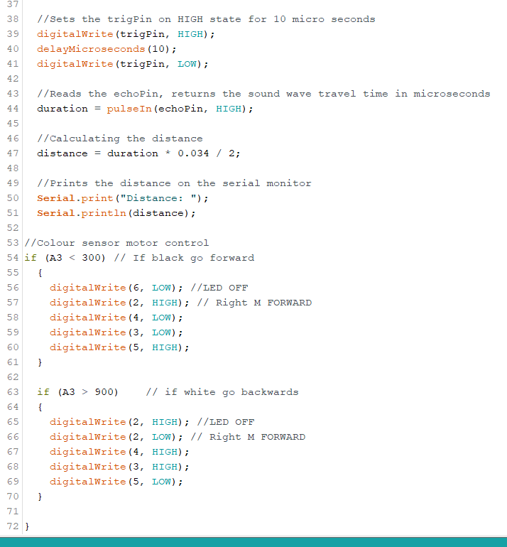 The code above was the set-up for the sesnor and the calculation of the distance in Centimeters.