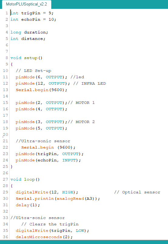 The Code above, MotorControl_v1, was our first attempt at controling a motor. For this we only used one motor to keep it simple until we had the motor working. The code includes one motor on D 7 & 8, an LED on D2 and the Infra-red sensor (discussed in the next section) on D9, it wasn’t used yet. The code first drives the motor forward for 3 seconds with the LED off, then it drives it in reverse for 3 seconds and the LED is on. The LED was used the make it easier to identify if the motor was in forward or reverse.