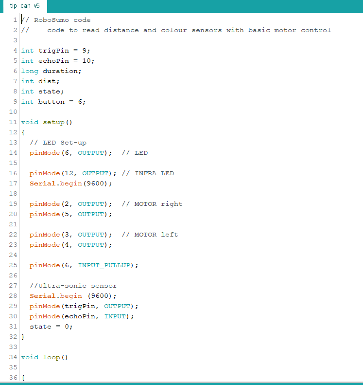 Once we has the motors and snsors working, reading data and controllling the motors we began work on the “Tip the Can” Challenge. This challenge is to build a robot that can search for the can and then advance towards it, touch it relativly gently and quickly. I.e it should stop when it touches the can and not continue driving into it.